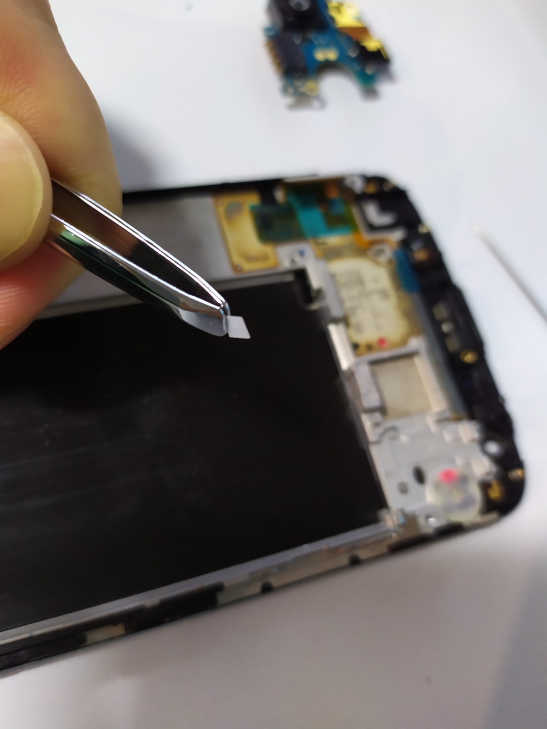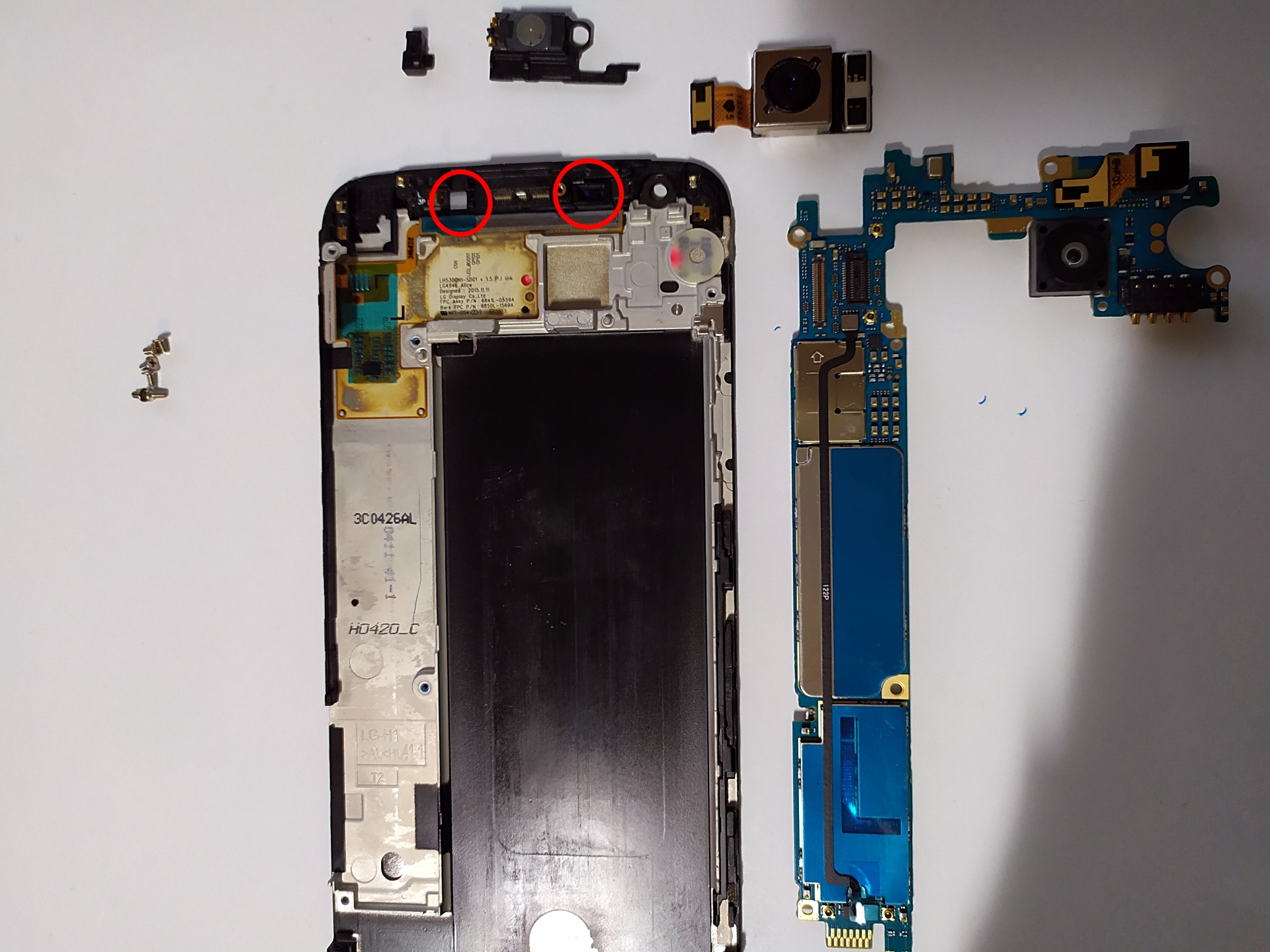 사진의 메인카메라 뒤편에는 양면테잎이 붙어있기 때문에 그냥 잘 뜯어내면 되고 수화부 스피커와 작은 고무부분은 핀셋이나 바늘 등을 이용해서 들어내면 된다.
